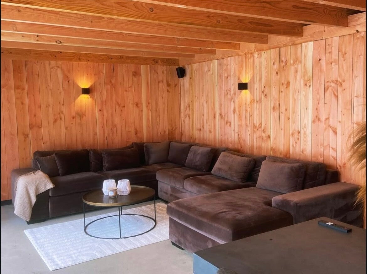 Deze gehele geïsoleerde veranda met schuur is gemaakt van geschaafd Douglas hout, gecombineerd met zwart afgewerkt hout. De combinatie van deze twee tinten geeft het geheel een luxe en moderne uitstraling. Aan beide zijden van dit buitenverblijf zijn lamellen geplaatst, die dienen als extra privacy en decoratie aan je veranda. Ons team zet zich volledig in om uw buitenverblijf comfortabel te maken en van hoge kwaliteit.